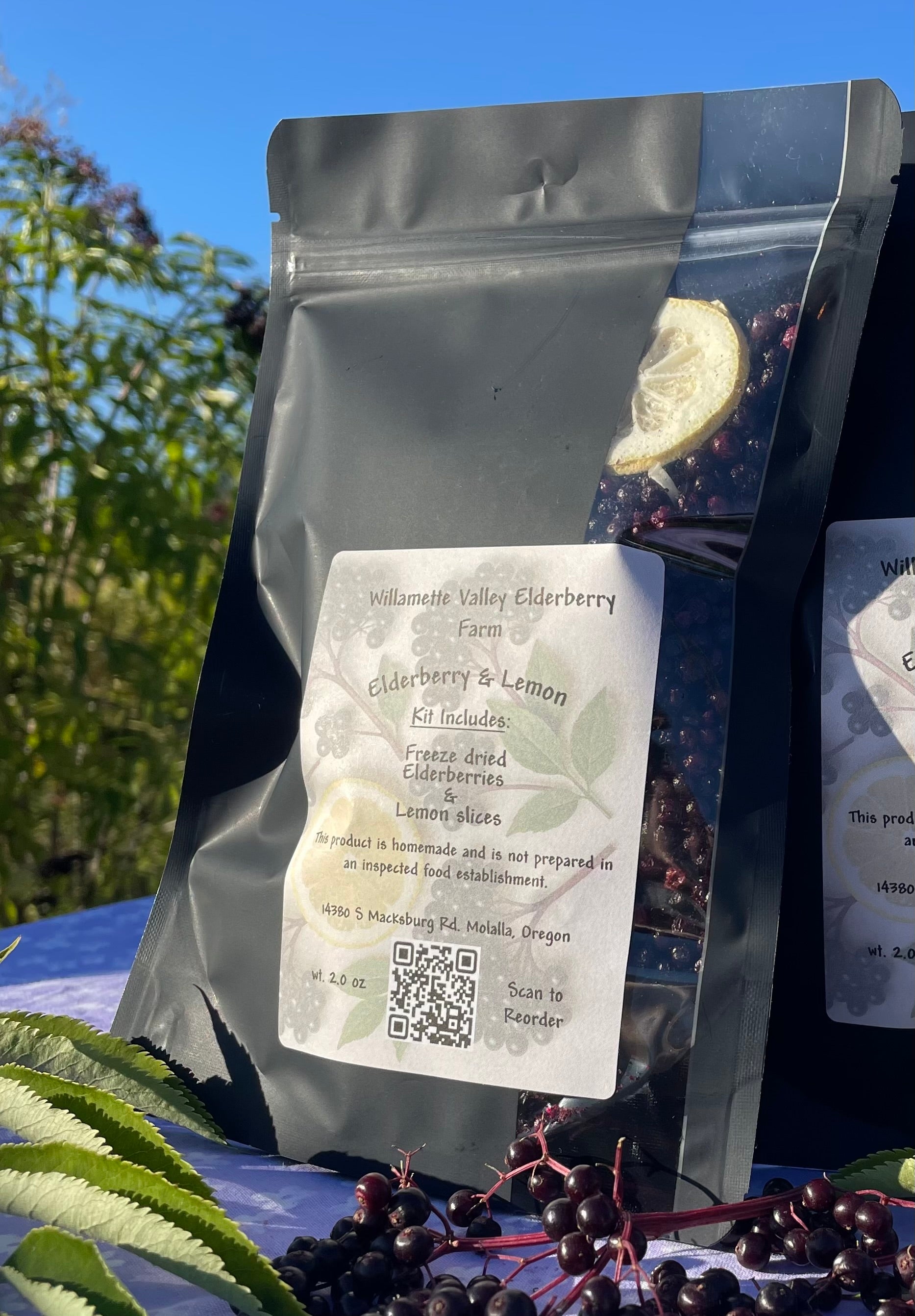 Freeze-dried elderberries grown in Oregons Willamette Valley and freeze dried lemon slices to add a little zest.